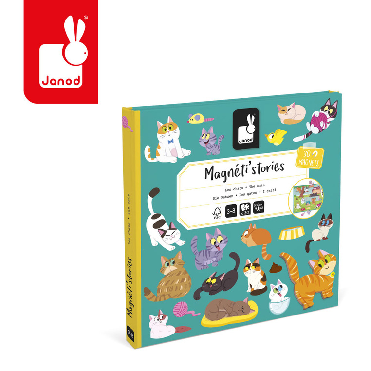 Оваа креативна магнетна играчка од колекцијата Magneti'stories на францускиот бренд Janod е наменета за деца од 3 години и овозможува создавање живописни сцени од светот на мачките. Сетот содржи 30 магнети со различни раси на мачки, како и додатоци и елементи од нивната околина.