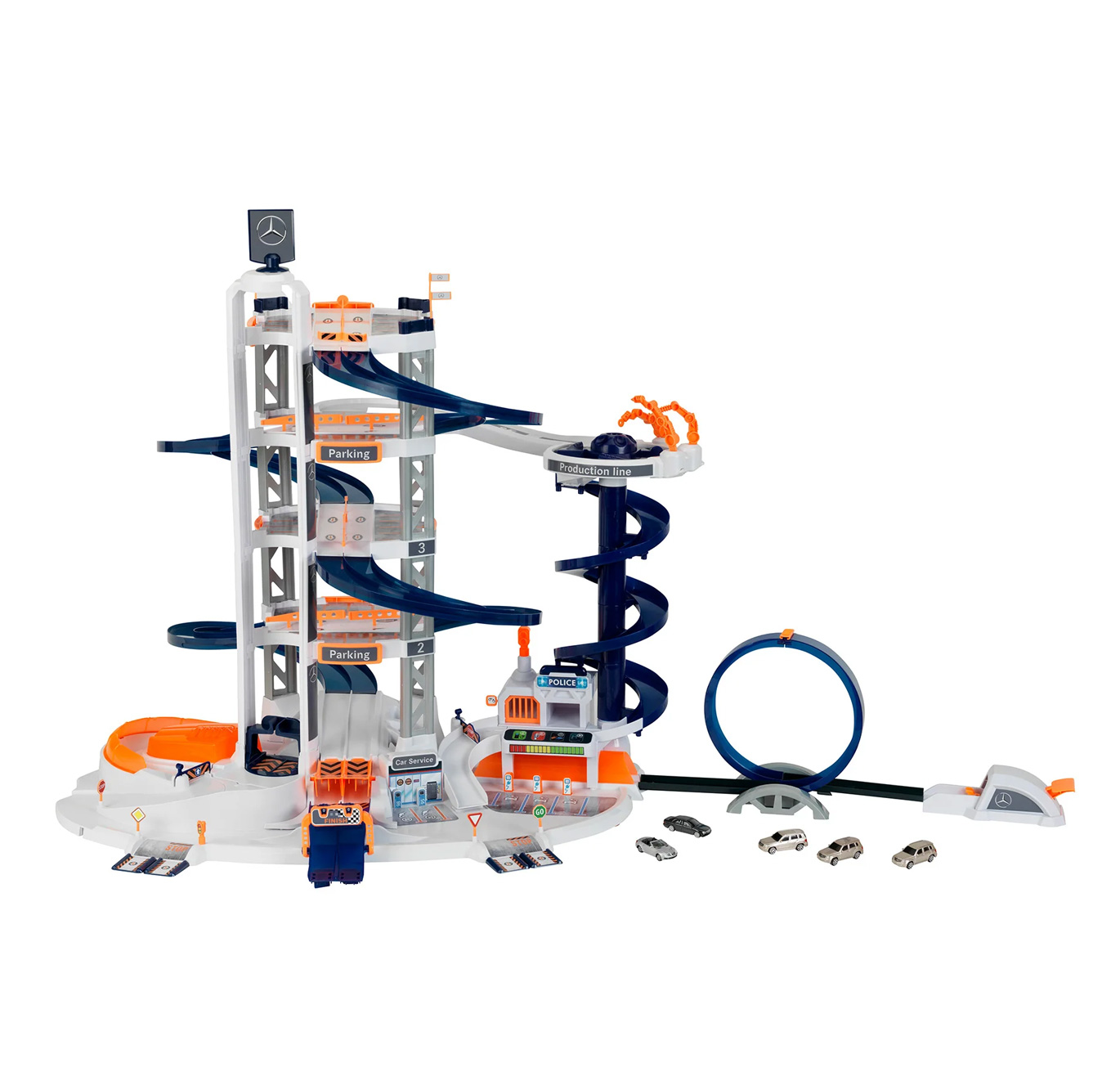 Добредојдовте во најголемата гаража за паркирање во светот на Mercedes-Benz! Тука сè се врти околу забава и брзина: На пет нивоа, возилата можат да прават кругови, да се тркаат низ тунели или да се „одбијат“ по ски-скокот. Светлосните и звучните ефекти на електричната полначница, радарската камера и полициската станица го прават искуството во гаражата уште пореално. Младите тркачи можат да ги управуваат своите возила низ ротирачкиот кружен тек, механичката роботска производна лента и возбудливата спирална кула. Без разлика дали станува збор за катапулт со лупинг или спуштање по спиралната кула — нема граници. Огромна забава за малите љубители на автомобили кои сакаат да си создадат сопствен свет.