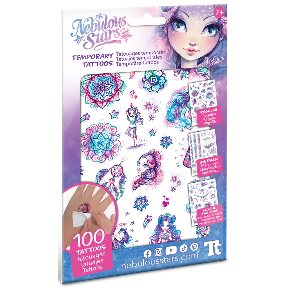 100 привремени тетоважи изработени од оригинални илустрации инспирирани од вашите омилени ликови од светот на Nebulous Stars. Вотри различни стила: светкави, металик и тетоважи што светат во темница.