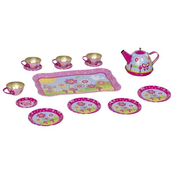 Овој 14-делен чај сет е изработен од метал без никел, идеален за игра на отворено за време на летото. Сетот е украсен со шарени мотиви во стилот „Flower Power“ и обезбедува часови забава за малите љубители на чај.