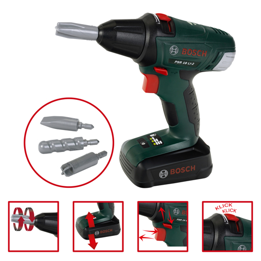 Овој безжичен шрафцигер на Bosch не само што изгледа неверојатно слично на неговиот оригинален модел на Bosch, туку всушност може да направи сè што може и оригиналот на начин погоден и безбеден за децата: има ротирачки, заменливи дупчалки/шрафцигери, може да се затегнат или олабават завртките, а исто така создава автентични звуци на дупчење. Благодарение на неговите заменливи делови, може да се справи со која било играчка завртка, а исто така може да ја осветли работната површина со притискање на копче. Секако дека е дизајниран да биде потполно безбеден за деца „нема остри рабови“. Безжичниот шрафцигер на Bosch одговара на сите системи за завртки Bosch и Technico направени од Klein Toys. Тој е совршен додаток во добро опремената работилница.