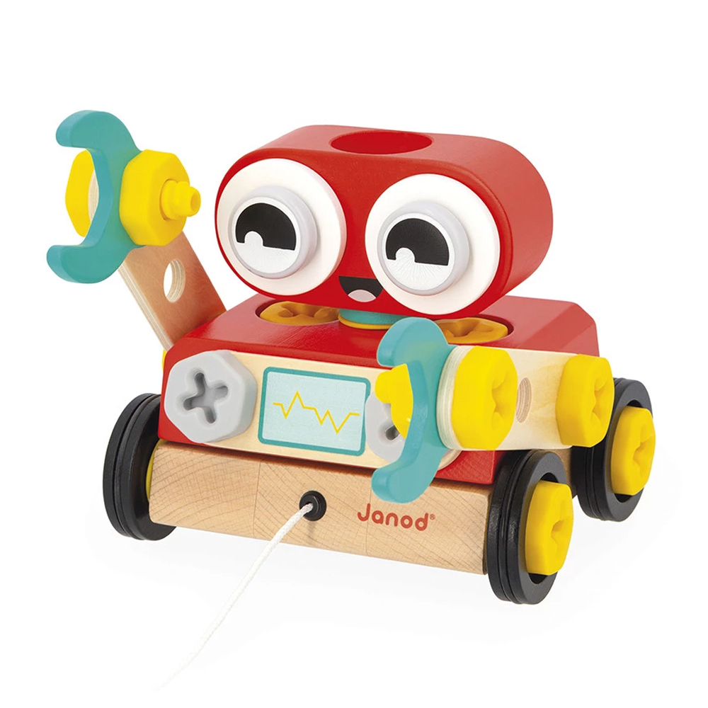 Запознајте го Brico’Kids роботот – симпатичен дрвен другар кој децата сами го составуваат и потоа го носат на прошетка низ домот! Овој креативен сет за составување е наменет за деца од 2 години нагоре и нуди забавен вовед во светот на конструкцијата и играта со улоги.