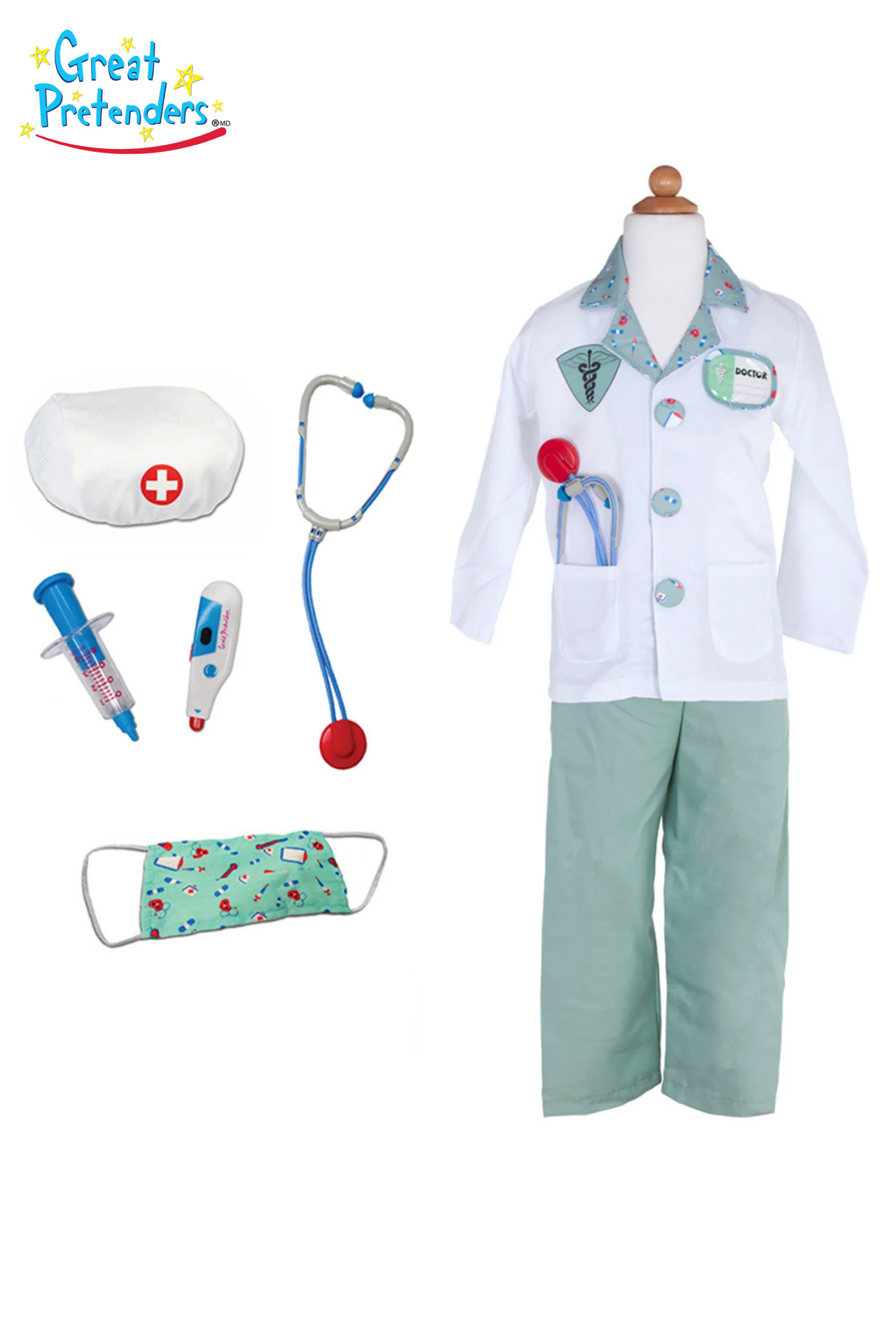 Убав комплет од 8 парчиња. Содржи: бело докторско палто, зелени пантолони, зелена маска, бела капа, стетоскоп, шприц и топломер. На палтото има и зашиен отстранлив држач за името на докторот којшто се прицврстува со леплива лента.