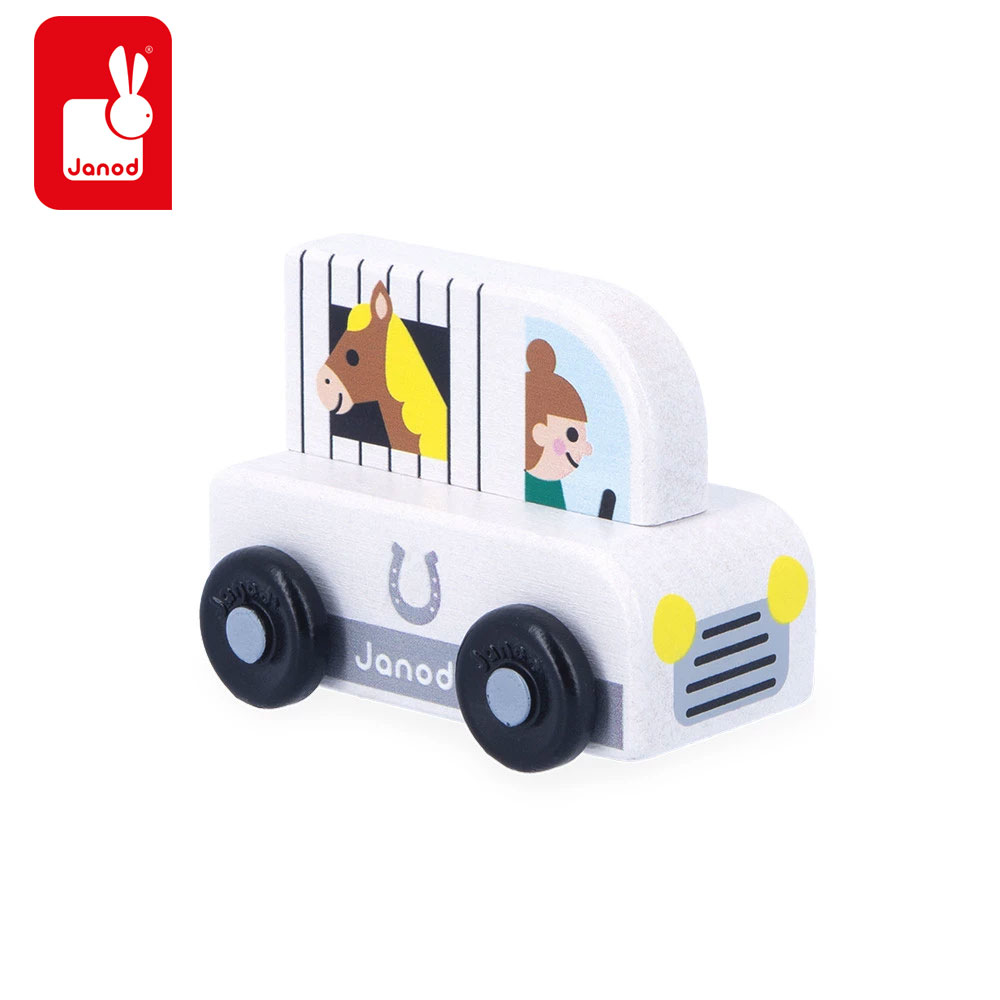 Ова мало возило Janod е дел од нашата колекција Cross Roads: серија подлоги за играње кои се уште позабавни кога се надополнети со нашите комплети со коцки и мали дрвени возила. Малата приколка за коњ е особено прилагодена за подлогата Низ селото, но се вклопува  подеднакво добро и со другите подлоги. Направен е од дрво со сертификат FSC™ од одржливо управувани шуми.