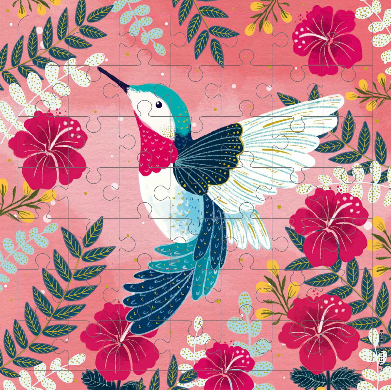Картичка со сложувалка од 49 дела | Тема на картичката - Колибри ● Димензии: 15,5 см x 15,5 см. ● Вклучува превиткана картичка со истата слика ● Вклучува бел плик ● Печатено на FSC-сертифицирана хартија.