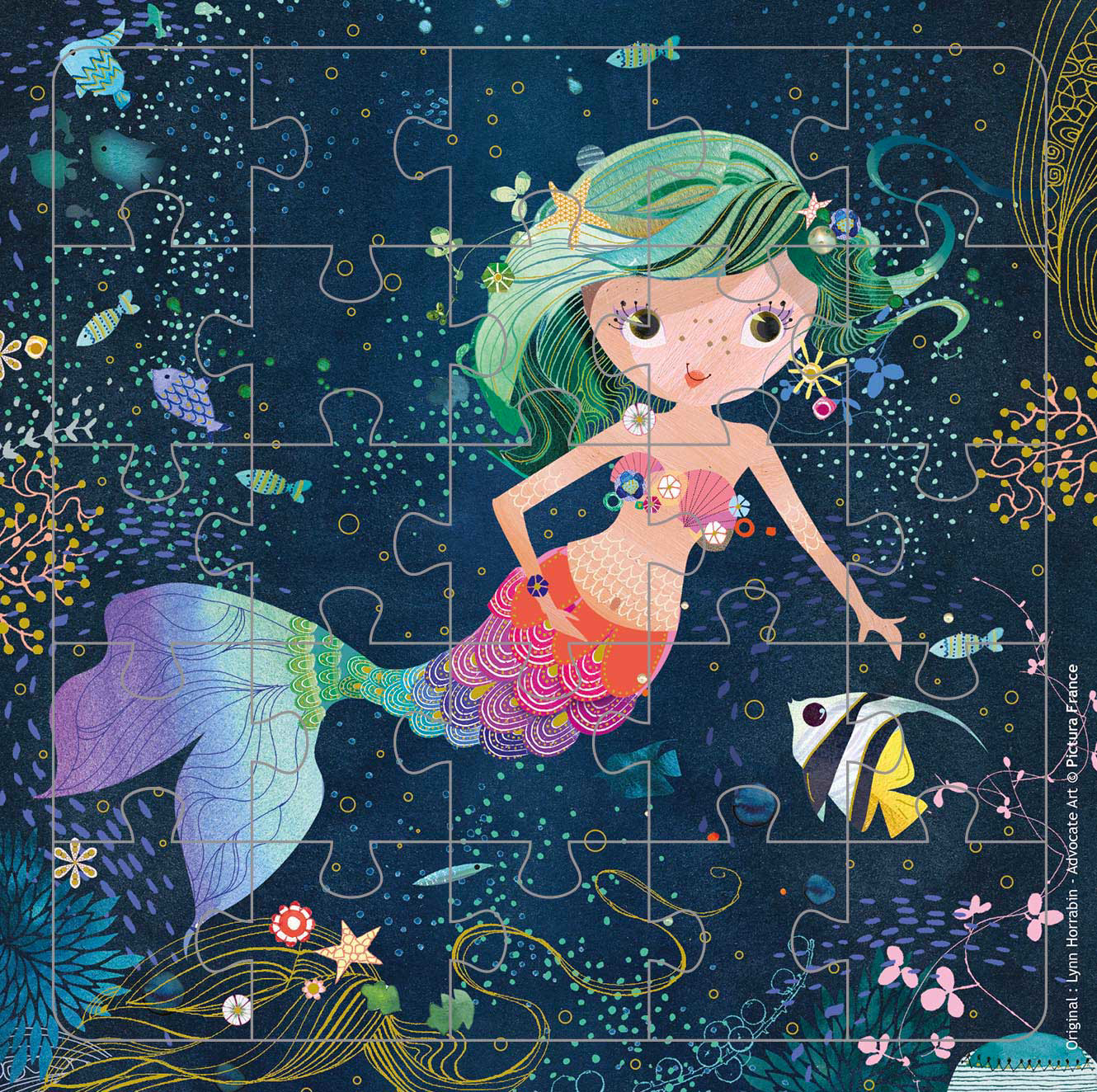 Картичка со сложувалка од 25 дела | Тема на картичката - Малата сирена ● Димензии: 15,5 см x 15,5 см. ● Вклучува превиткана картичка со истата слика ● Вклучува бел плик ● Печатено на FSC-сертифицирана хартија.