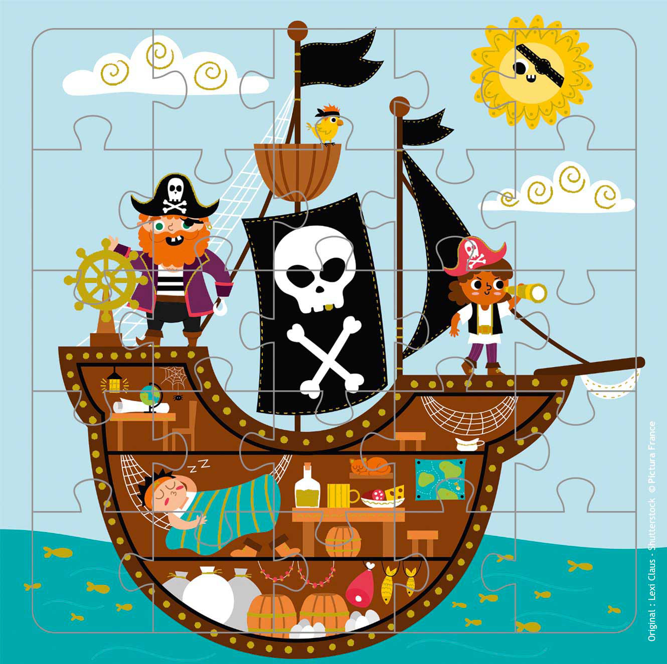 Картичка со сложувалка од 25 дела | Тема на картичката - Пиратски брод ● Димензии: 15,5 см x 15,5 см. ● Вклучува превиткана картичка со истата слика ● Вклучува бел плик ● Печатено на FSC-сертифицирана хартија.
