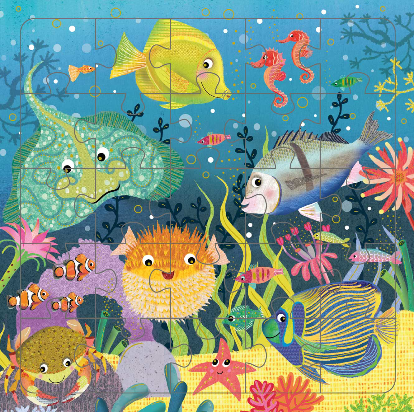 Картичка со сложувалка од 25 дела | Тема на картичката - Риби во океан ● Димензии: 15,5 см x 15,5 см. ● Вклучува превиткана картичка со истата слика ● Вклучува бел плик ● Печатено на FSC-сертифицирана хартија.