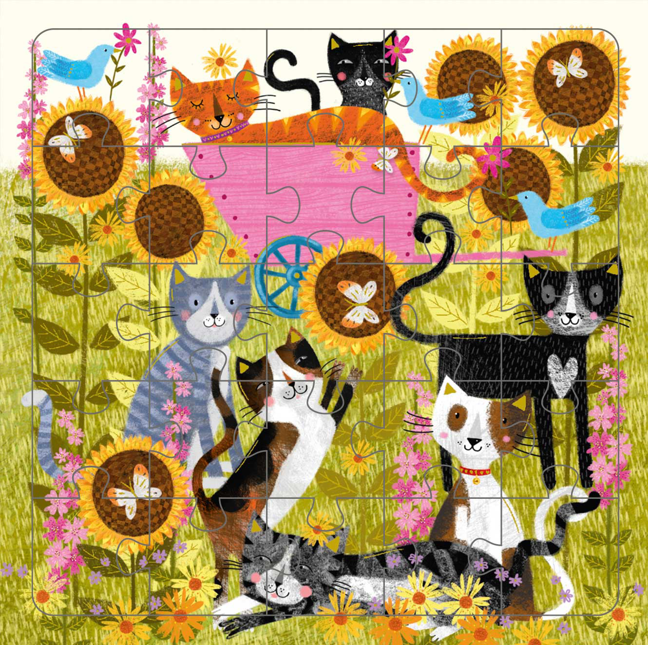 Картичка со сложувалка од 25 дела | Тема на картичката - Смешни мачки ● Димензии: 15,5 см x 15,5 см. ● Вклучува превиткана картичка со истата слика ● Вклучува бел плик ● Печатено на FSC-сертифицирана хартија.