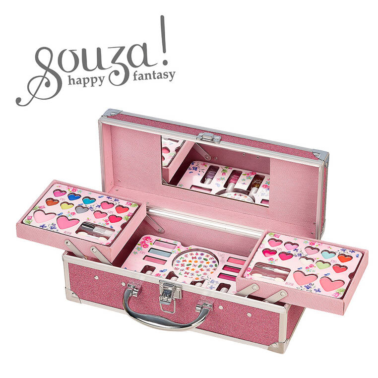 Овој голем комплет на 2 нивоа, со детска козметика за шминкање од холандската марка Souza, содржи: 4 лакови, 11 кремасти кармини/сјаеви за усни, 15 сенки за очи во прекрасни бои, 4 руменила и лист со мали налепници за нокти. Сетот вклучува и 2 двојни апликатори со сунѓери и 2 нежни четки.