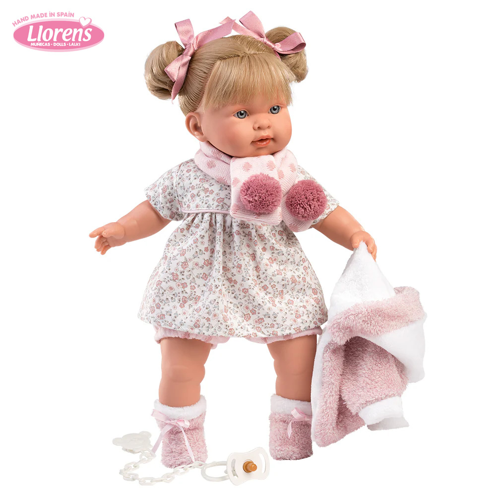 Кукла АЛЕКСАНДРА со шал и јакна со капа, 42 cm (плаче, вели мама и папа) – Llorens Dolls
