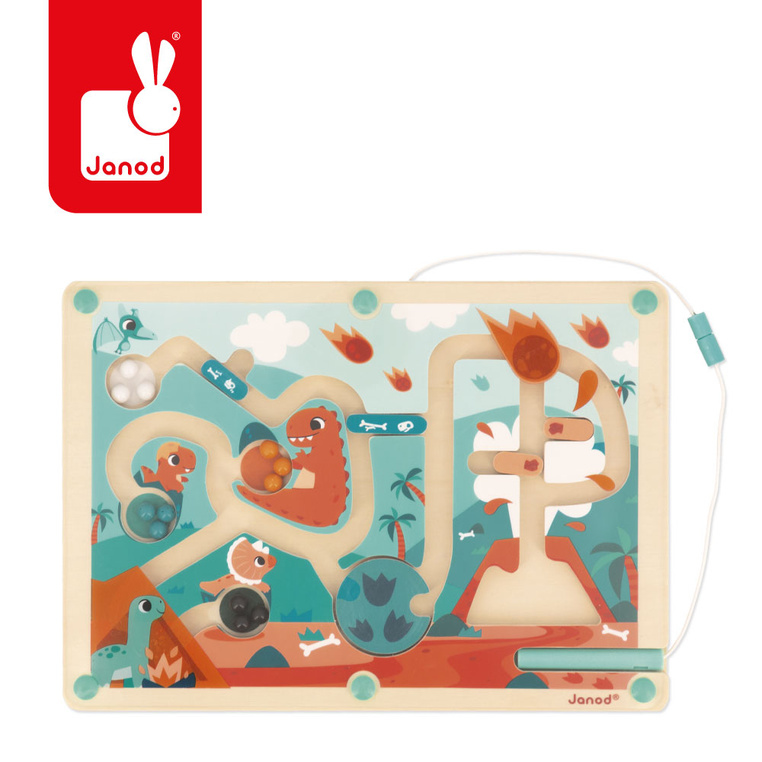 Овој магнетен лавиринт со диносауруси од францускиот бренд Janod е забавна и ангажирачка игра која ги учи децата на трпеливост и прецизност. Целта е да се пренесат 12-те топчиња низ лавиринтот до соодветните диносауруси и нивните обоени зони, користејќи магнетно пенкало. Предизвикот е уште поинтересен благодарение на подвижните бариери, ротирачкото тркало и двата тајни премини.