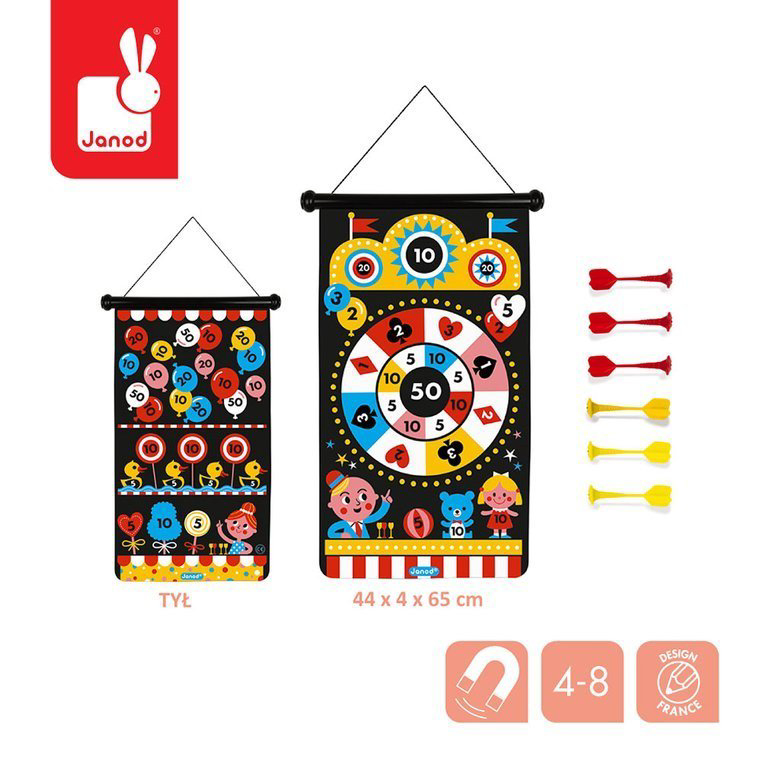 Играта Магнетно пикадо - ПАНАЃУР од францускиот бренд JANOD е одлична забава за децата и родителите. Комплетот се состои од изролана табла за пикадо со врвка за закачување, на пример на ѕид,  и 6 магнетни пикада во две бои (3 црвени и 3 жолти). Црната ткаенина на таблата за пикадо е илустрирана од двете страни со фигури на шарени роботи и други космички мотиви.