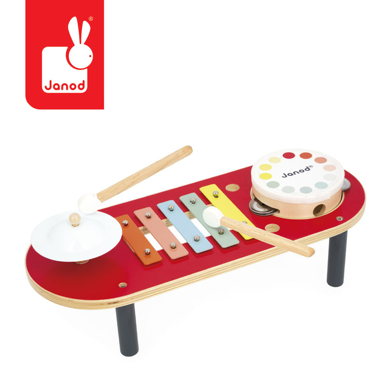 Содржи: 1 ксилофон, 1 тапан, 1 чинела и 2 палки прилагодени за мали детски раце. Пракса и ред – палките може да се чуваат во специјални отвори на масата!