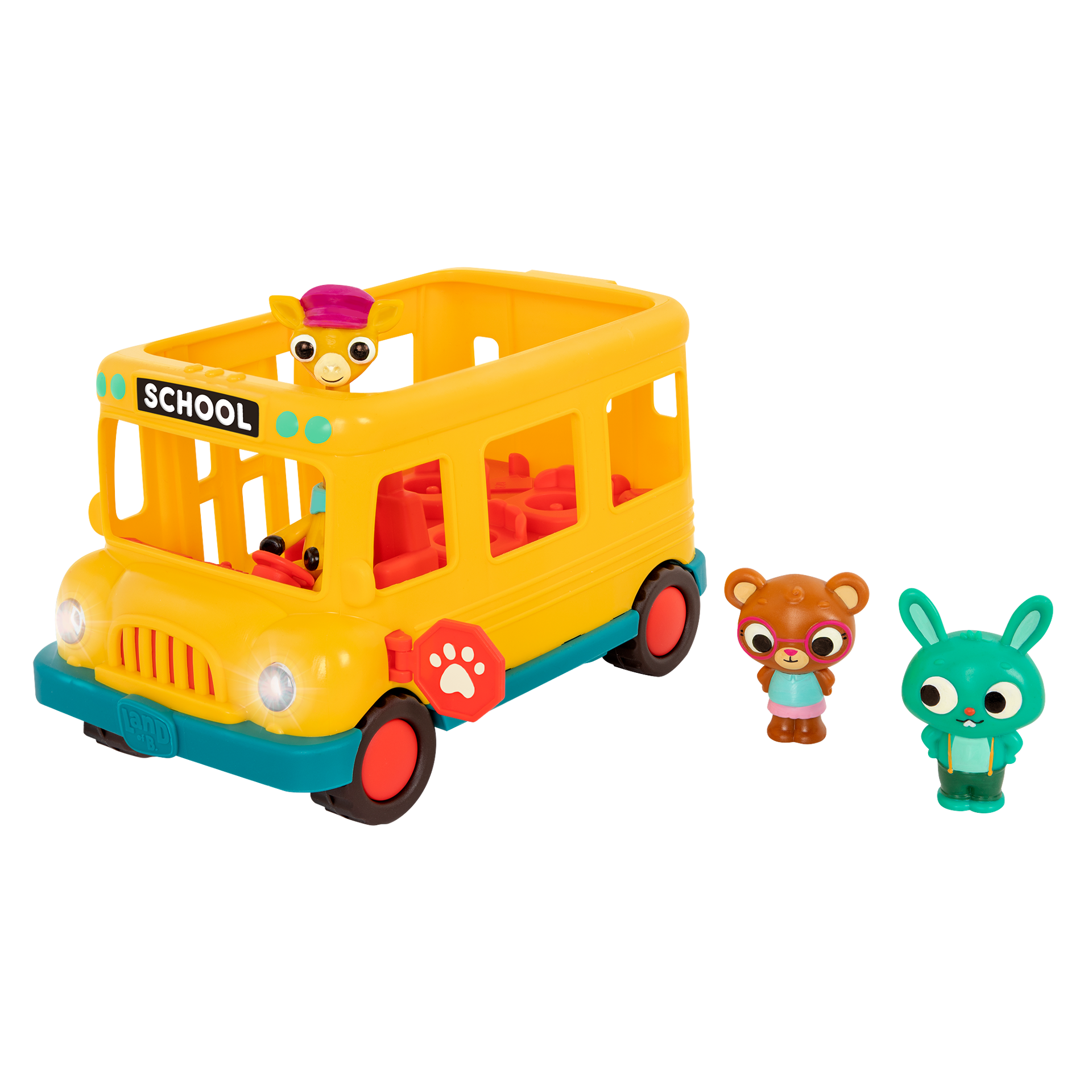 Скокајте, пејте заедно и одете до училиште во школскиот автобус на Бони од B. toys! Возете се до некоја попатна автобуска станица, отворете го знакот за застанување, отворете ја вратата и оставете ги двајцата студенти да се качат во автобусот. Додека се брзате да стигнете на час, притиснете на главата на Бони за светла и звуци и пејте заедно со The Wheels on the Bus Go Round and Round. Возете до училиште и гледајте ги учениците како се забавуваат додека одите! Забавните карактеристики на овој музички автобус поттикнуваат сетилен развој и промовираат креативна игра.