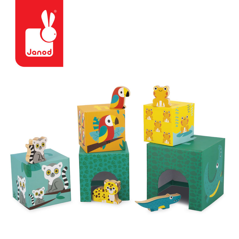 Прво, можат да ги редат коцките од најголема до најмала и да ја изградат пирамидата. Секоја коцка претставува различно животно и големина – на пример, лемурот е поголем од папагалот и затоа се наоѓа на пониско ниво.