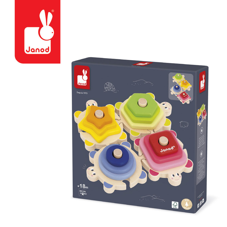 Оваа дрвена едукативна игра од колекцијата Zigolos на францускиот бренд Janod им овозможува на децата да откриваат форми, големини и бои на забавен начин. Сетот се состои од четири основи во форма на желки кои може да се спојуваат како сложувалка.