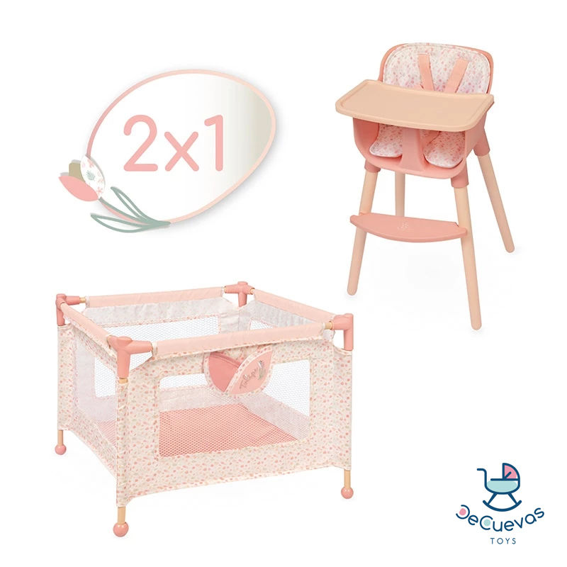 Овој елегантен сет за кукли комбинира практичност и стил. Содржи високо столче за хранење и детска лулка/лежалка, кои може да се користат заедно или одделно. Направен е од квалитетни и лесни материјали, совршен за деца кои сакаат да се грижат за своите кукли.