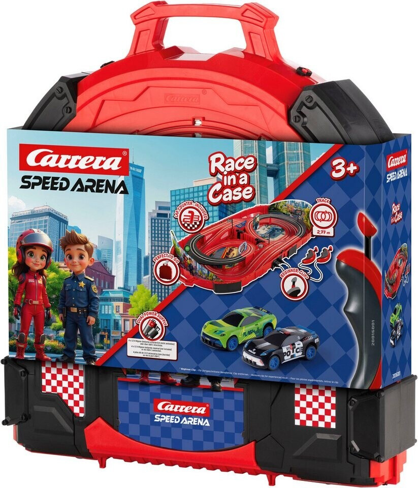 Со оваа тркачка патека Carrera Police Chase, децата од предучилишна возраст па нагоре можат да доживеат возбудливи трки и адреналински полициски потери – каде било и во секое време! Благодарение на практичниот куфер за носење, сетот нуди максимална флексибилност: само отворете го, стартувајте и за неколку секунди влезете во светот на Carrera.